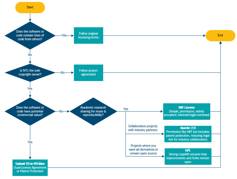 If your research software or code has potential commercial value, NTUitive should be informed as early as possible to safeguard its value and support downstream commercial applications. NTU researchers should submit a Technology Disclosure (TD) to NTUitive so that the University can assess whether to pursue patent protection, particularly for code or software with strong commercial potential and sufficiently broad patentable claims.